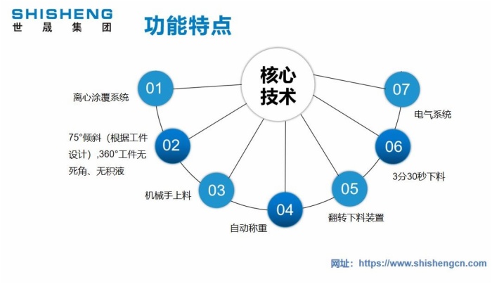 世晟集團(tuán)800系列全自動達(dá)克羅涂覆生產(chǎn)線的設(shè)計(jì)和制造,是基于使用各種有鉻、無鉻達(dá)克羅涂料(水劑和油劑)對金屬工件進(jìn)行表面涂覆工作,也可用于其它非鋅鋁涂料的零件表面涂覆、著色或封閉加工。全自動浸甩一體機(jī)由浸槽(SUS304)、甩干機(jī)構(gòu)(可傾斜)、槽體、槽蓋、涂液攪拌裝置、涂液回收裝置、涂液溫度調(diào)節(jié)系統(tǒng)、工件回轉(zhuǎn)輸送系統(tǒng)(升降采用氣缸)、涂液攪拌控制系統(tǒng)和料筐、小車翻轉(zhuǎn)上料裝置、伸縮式網(wǎng)帶輸送機(jī)、稱重系統(tǒng)。