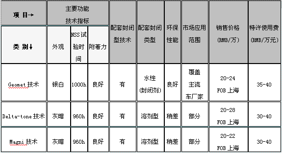 對(duì)Geomet系列、Delta-Tone系列、Magni系列三項(xiàng)無鉻技術(shù)進(jìn)行比較,Geomet無鉻涂料底涂、面涂均為水性涂料,且Geoemt技術(shù)得到國際幾乎所有主流汽車廠家的認(rèn)可,而Delta-Tone系列和Magni系列底涂為水性涂料,但面涂仍為有機(jī)溶劑型涂料,只是僅被部分廠商認(rèn)可。